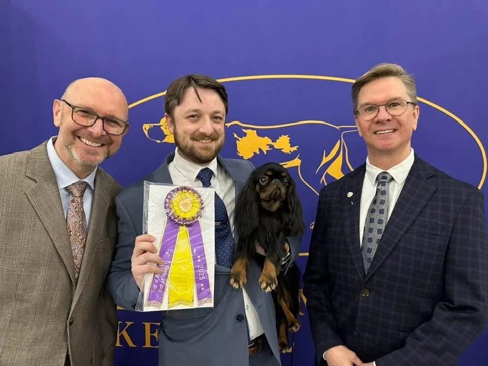 Beverly Leslie winning Best of Variety at the 2025 Westminster Kennel Club! Pictured with her breeders, Douglas A. Johnson and Jamie Hubbard (not pictured, Corrine Dooley)
